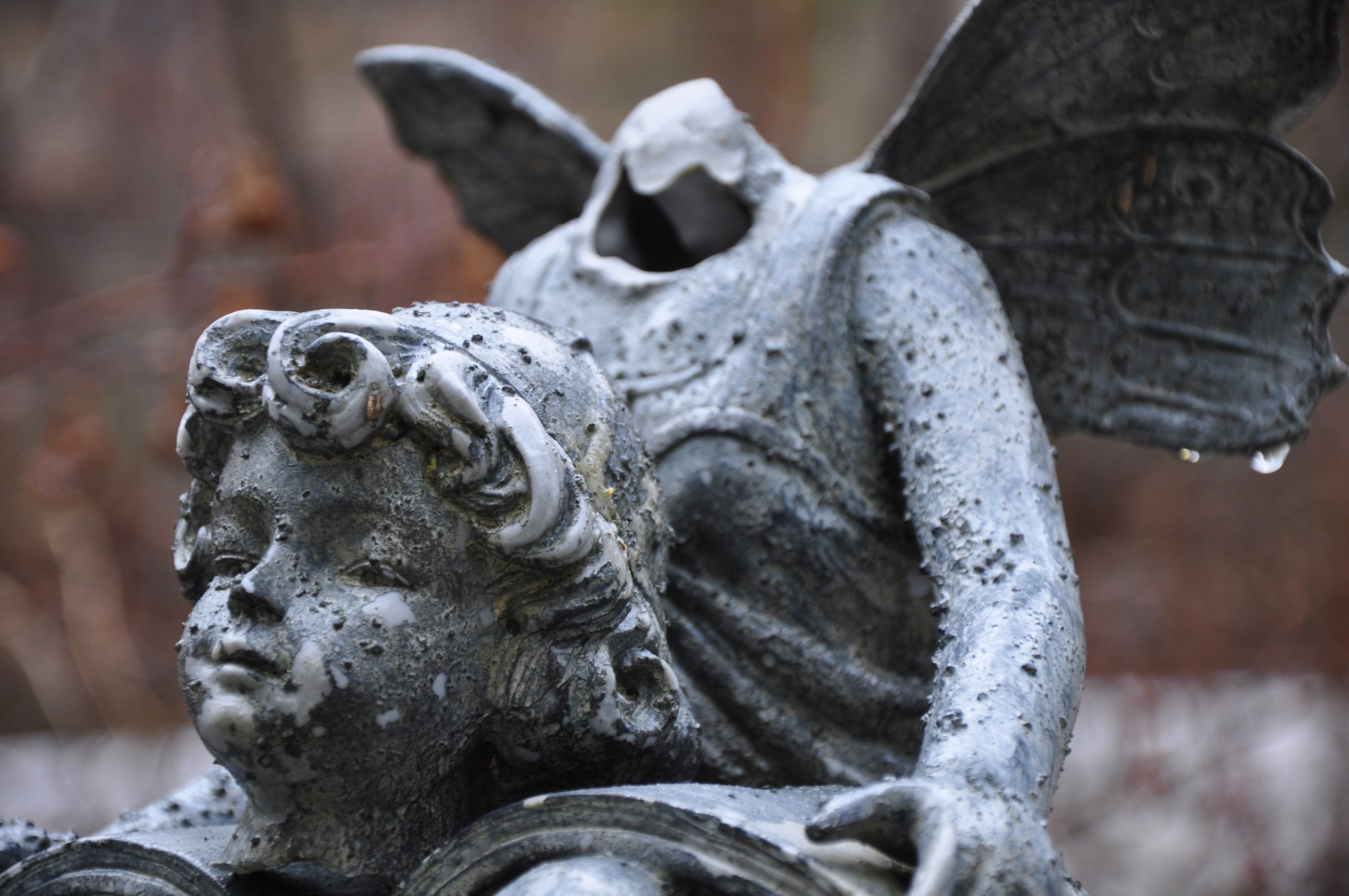 So, it was treacherous running on the slick roads, and I turned back, parking my car at the top of the road, too dangerous to slide into home. I walked down through the woods, camera around my neck, looking for something good in the beginning of this day. This poor headless angel is always having her picture taken. But what a lovely supercooled droplet had formed on her wing.