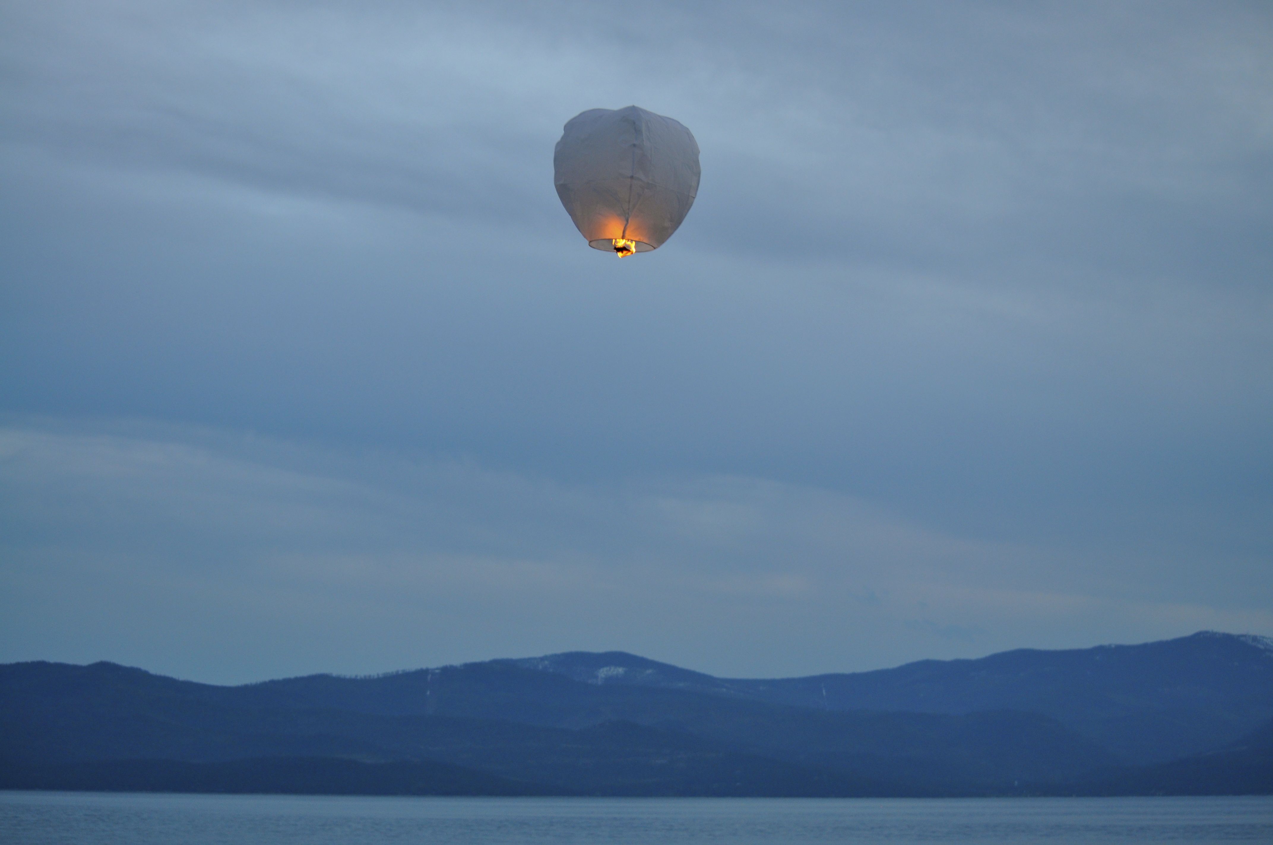 05.17.14 I was so delighted by this wishlantern, floating over the lake in the enchanting blue hour, that I failed to make a wish. Our friends brought it as a gift, and after dinner, they each held a side of the lantern, lit the fuse, and when it filled with hot air, they gently let it go from their hands. It rose up over the lake, before drifting to the east, high above the hills behind us. With the scent of wood smoke in the air from a burning slash pile, we talked of how dangerous this would be in the summer when the forests are heated up by our long summer days. But, right now, in the springtime, it was pure magic to see this lantern of light float above the water.