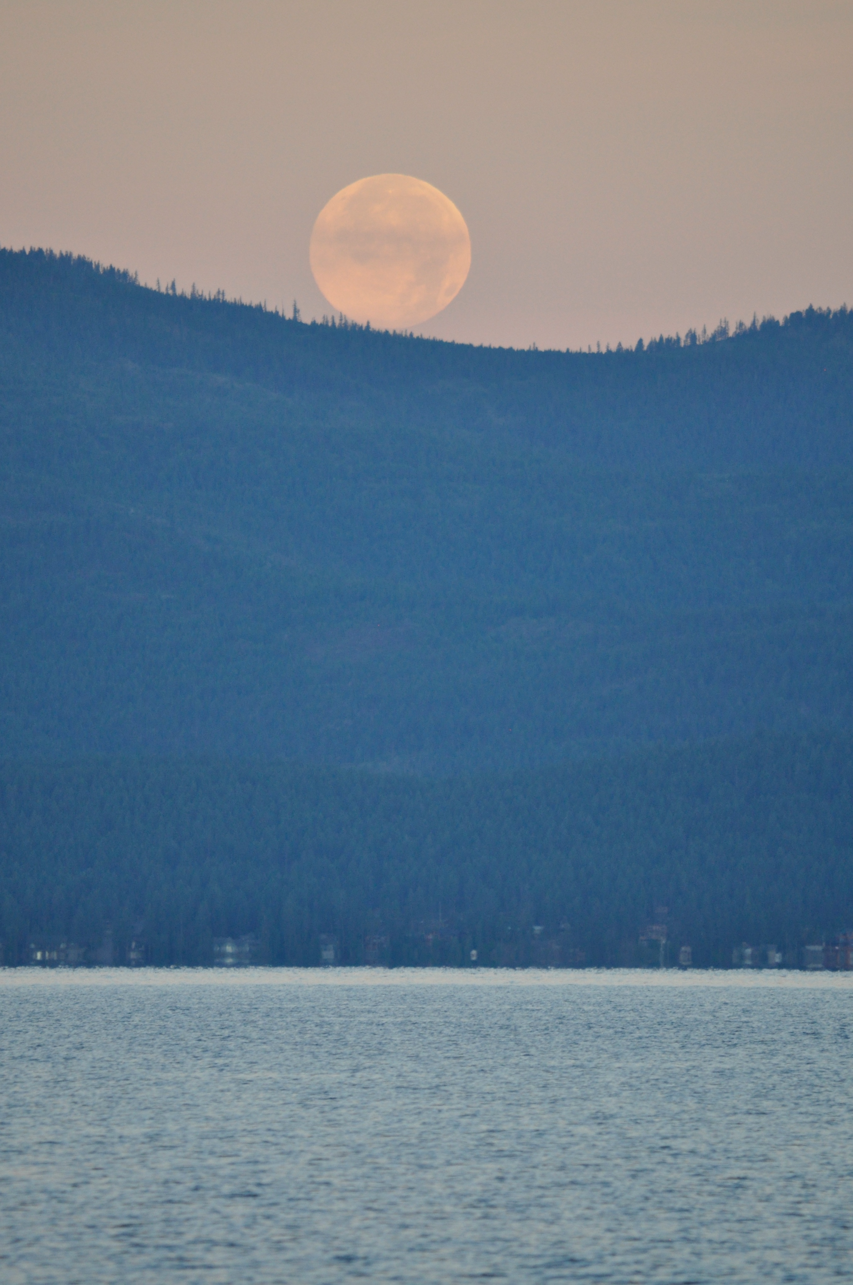 07.31.15 July ends with a blue moon. The Earth&Sky blog says we won’t have two moons again in the month of July until 2034, so it was worth getting out of bed early, grabbing my camera, and running down to the dock in my jammies to take a photo this morning. It has been coming up over the dark trees in the forest like a bright white spotlight the last few nights, bathing everything in light. The deer have had a heyday–decimating the geranium pots down at water’s edge, and cleaning out my kitchen window box. Well, tomorrow is August.